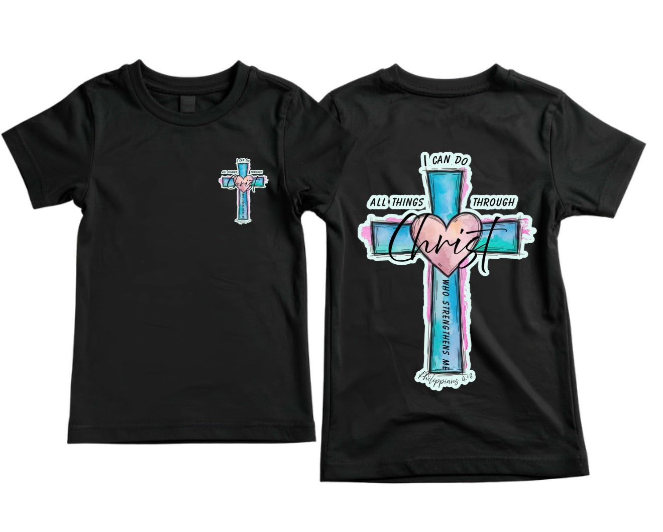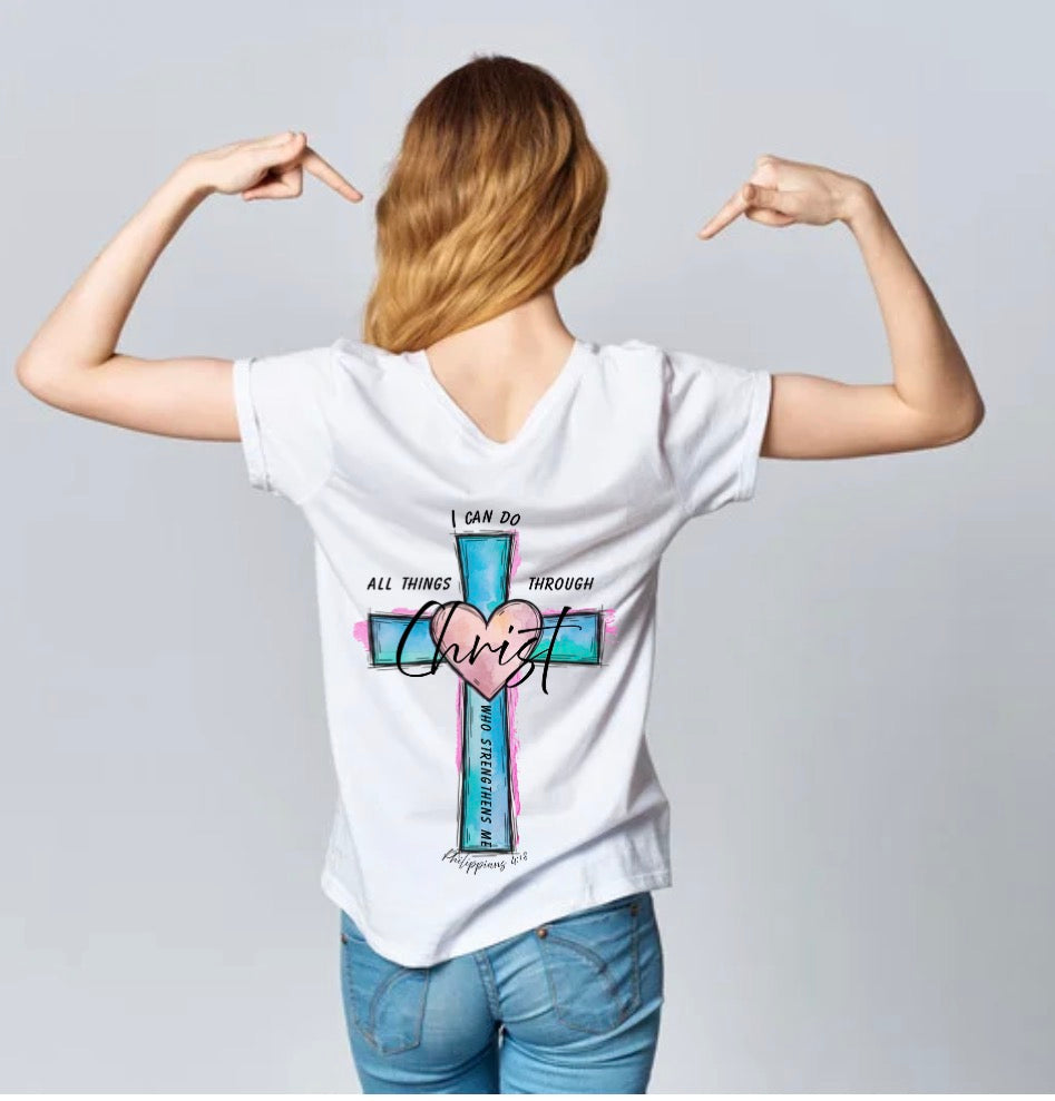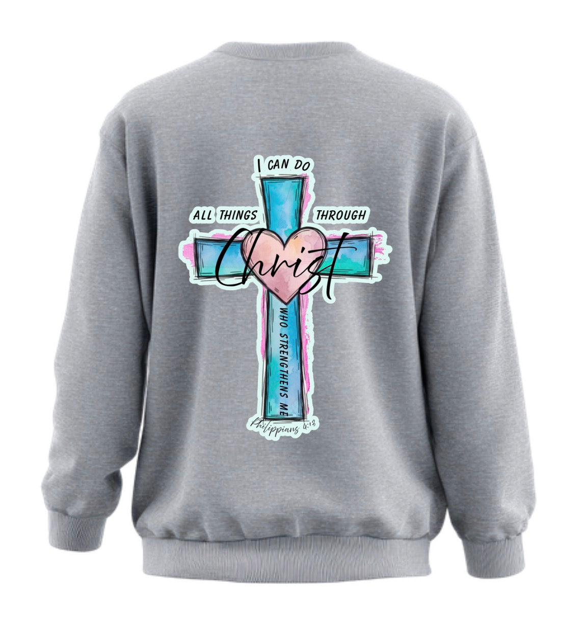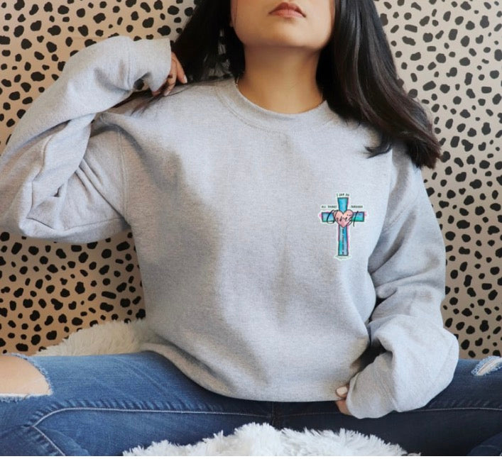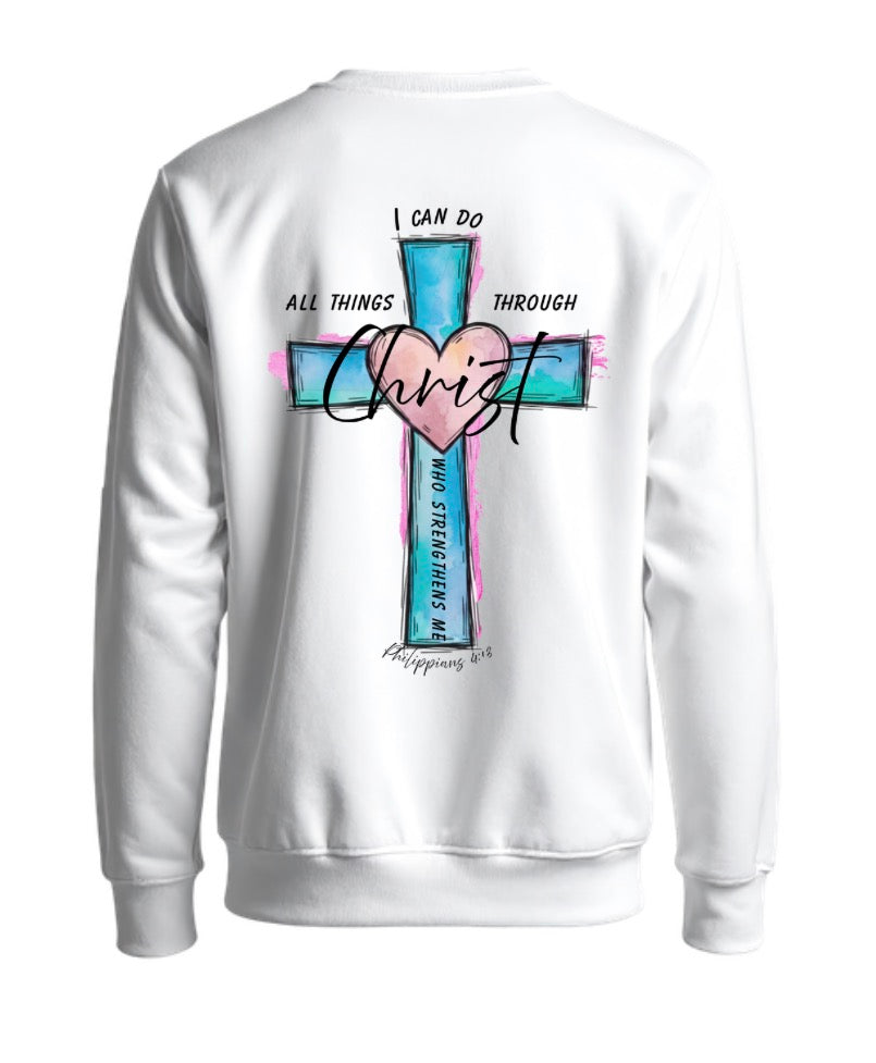 This cozy sweatshirt features a vibrant cross design with a soft heart detail and hand-drawn style accents. The message “I can do all things through Christ who strengthens me” is displayed boldly on the back, with a smaller coordinating design on the front for a subtle, everyday faith statement.